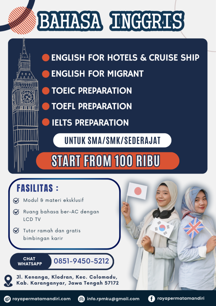 Tingkatkan kemampuan Bahasa Inggrismu dengan metode yang praktis dan interaktif. Cocok untuk pelajar, mahasiswa, hingga profesional yang ingin lebih percaya diri berkomunikasi dalam bahasa internasional ini.